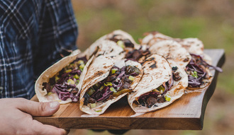 Pas på – det går hurtigt! Læg en tortilla på stegepladen, fyld med kød, de stegte grøntsager og revet mozzarella. Fold brødet sammen. Når osten begynder at smelte og brødet er gyldent, løft det af. Åbn quesadillaen og top med syltet rødkål, jalapeñosauce og hakket forårsløg før servering.