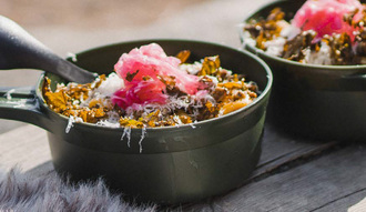 Tænd et bål, og lad stegepladen blive godt varm over ilden. Steg svampene i smør, indtil væsken er fordampet. Tilsæt jordskokker og steg dem gyldne.