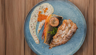 Sauce: Varm fløden i en gryde. Når den begynder at simre, rør crème fraiche og smør i. Tilsæt salt, peber, dild og saft af en halv citron. Lad simre i ca. 10 minutter. Vend purløg og ørredrogn i lige før servering.